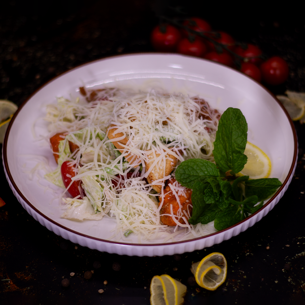 Обжаренный лосось, листья салата, томат, сыр "Пармезан", гренки, заправка "Цезарь".
